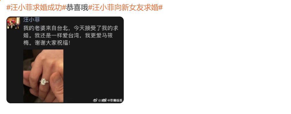 疑似汪小菲的一又友圈晒出求婚适度图,并配文示意“我的内助来自台北,今天采纳了我的求婚。我照旧不异爱台湾,我更爱马筱梅。谢谢全球祝贺!”